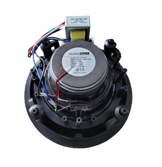 Zwei-Wege-Lautsprecher mit 6,5"-Tieftöner und 1"-Hochtöner, maximale Leistung von 60 W RMS in 8-Ohm-Leitung, mit 100-V-Leistungsabgriffen von 30, 15 & 7,5 W. Ebenfalls erhältlich ist der niederohmige Anschluss von 8 Ohm.Die maximale Deckenstärke beträgt 35 mm.