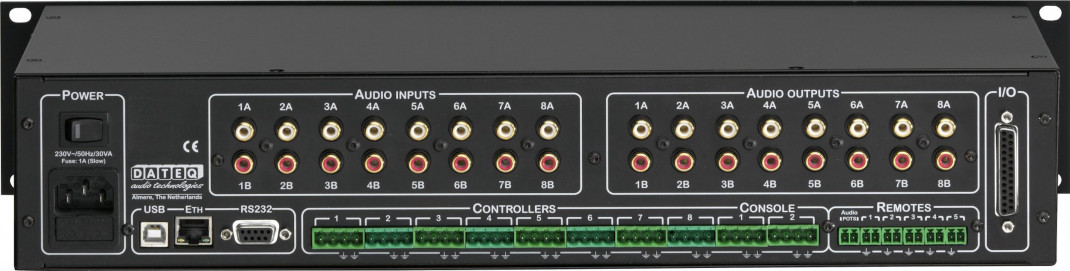 Mehrzonen-Paging-Matrix-Musiksystem basierend auf einer internen Web-Anwendung. Matrix für 8 Zonen. 16 Audioeingänge, 8 Zonenausgänge, konfigurierbar als Mono oder Stereo. Anschluss für 2 Paging-Panels MPC8A