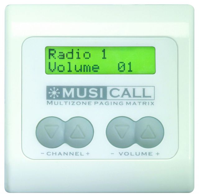 Fernbedienungspanel für die Wandmontage mit LCD-Display zur Kanal- und Lautstärkewahl, weiss