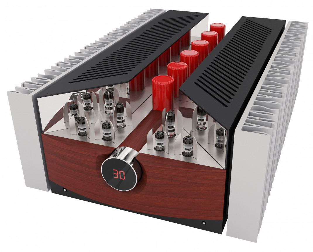 Vollverstärker, 100W @ 8 Ohm, Pure Class A, doppelte INPOL Technologie, Röhren: 2x ECC803s TungSol, 1x 6H30 pro Kanal, 3 Line-Eingänge RCA und 3 symmetrische XLR, schwarzes Padouk