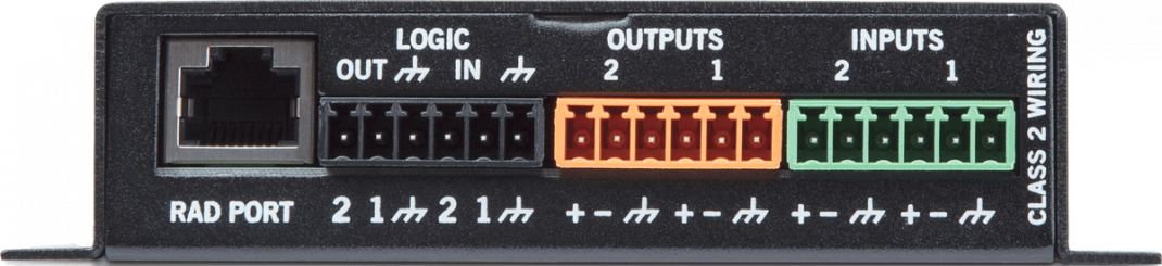 Zwei Logikein- und -ausgänge verbinden andere Geräte mit der HAL über Toggle oder Befehle, wie z.B. Push-to-Talk oder Mute-Schalter, Projektoren, Lampen, Alarme usw. Logic In verbindet einen Gerätekontaktschalter zwischen Pin 1 oder 2 mit Masse. Logic Outs sind 5 V hoch oder 0 V niedrig. Die galvanische Isolierung verhindert, dass der Stromfluss zwischen dem RAD und der technischen Host-Masse den Ton stört. Die Euro-Anschlüsse akzeptieren Drähte zwischen 30 und 14 AWG. Der RAD16z ist nur in Schwarz erhältlich. Montierbar auf jeder ebenen Oberfläche.