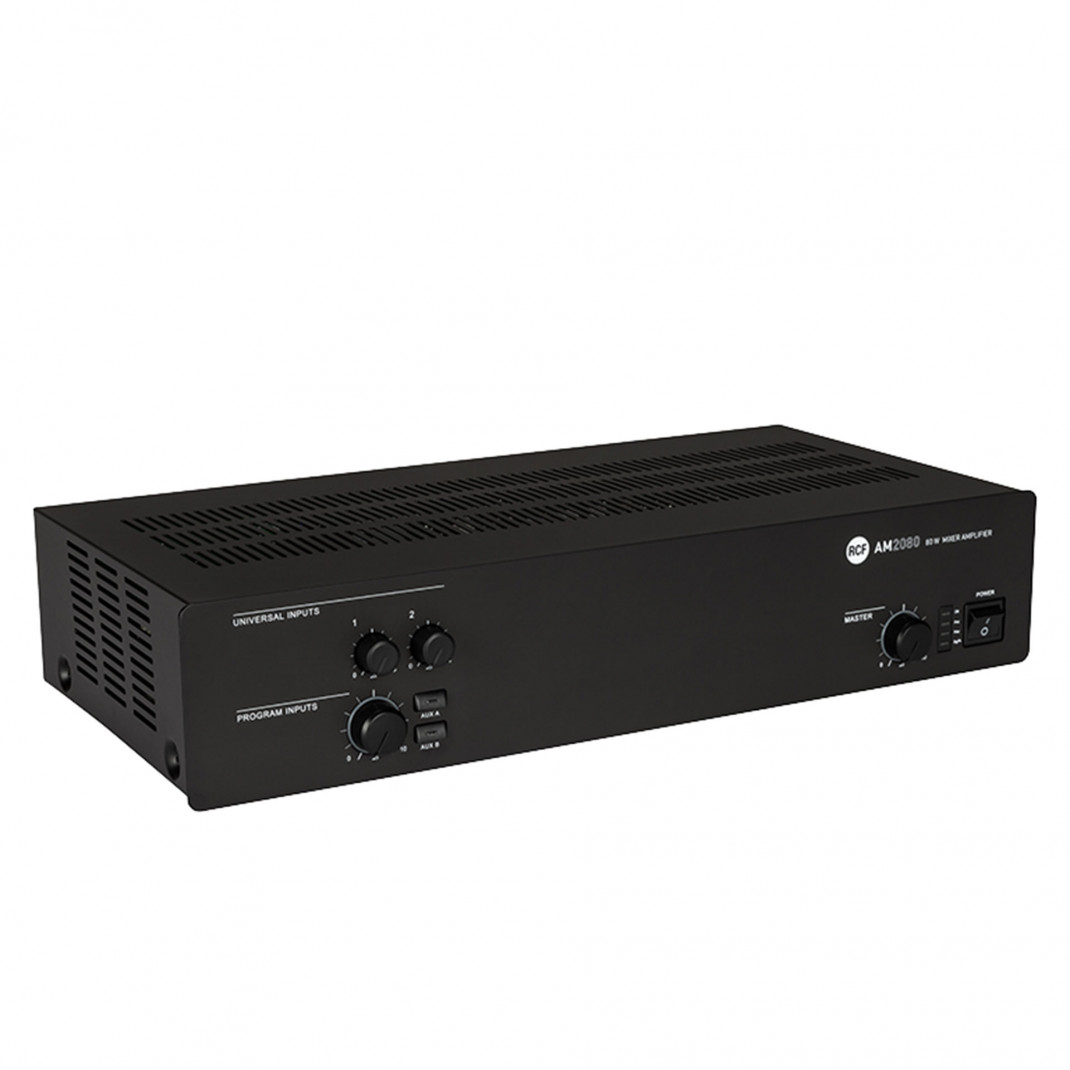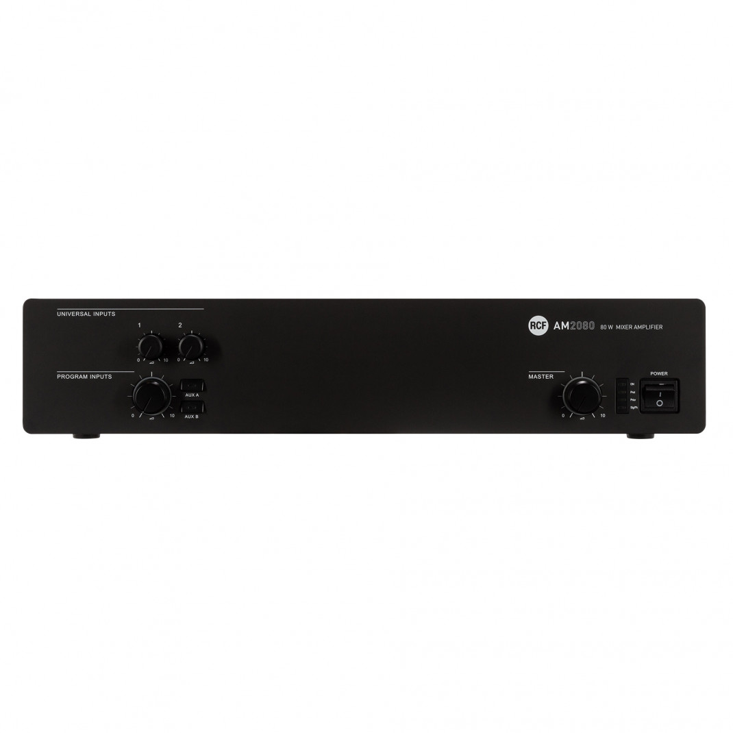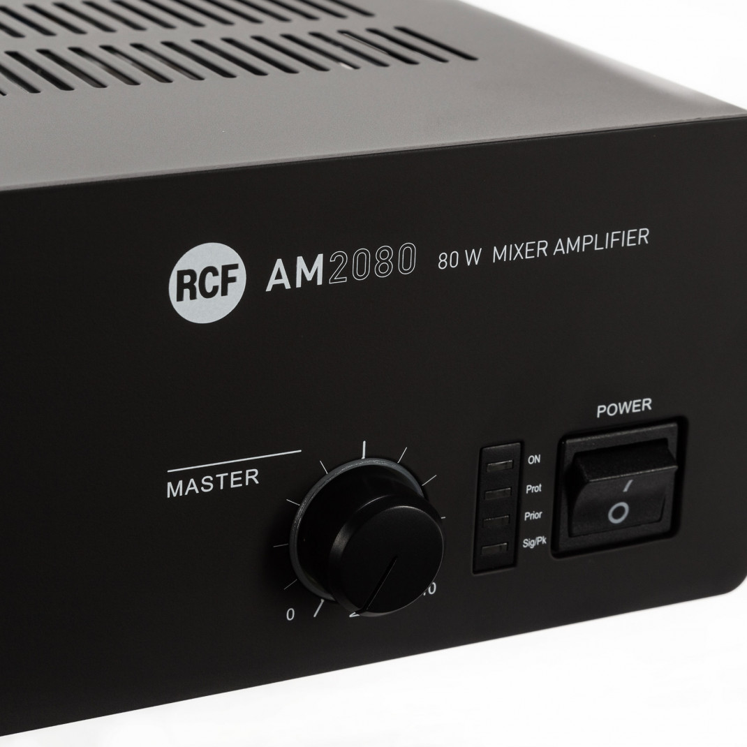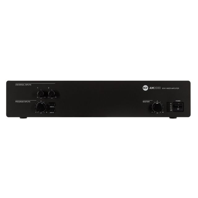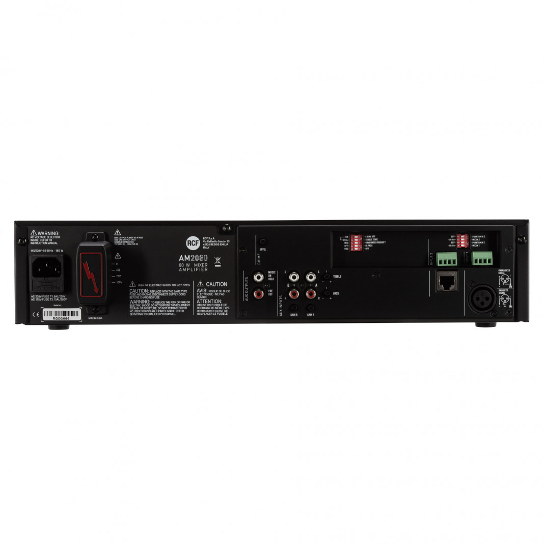 Der AM 2080 ist ein Mixer/Verstärker mit 2 Mikrofon-/Line-Audioeingängen über abnehmbare Stecker (der erste Eingang elles ist auch über XLR verfügbar) und 2 Aux-Eingängen für Musikquellen (CD-Player, Tuner usw.).Der Verstärker hat eine Nennleistung von 80 Watt. Der Ausgang des Verstärkers kann entweder Lautsprecher mit niedriger Impedanz (mindestens 4 Ω) oder eine Leitung mit konstanter Spannung von 100 - 70 V (für Lautsprecher mit Transformatoren 100 - 70 V) versorgen.