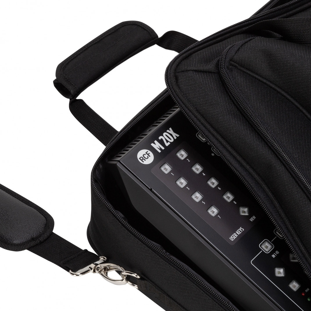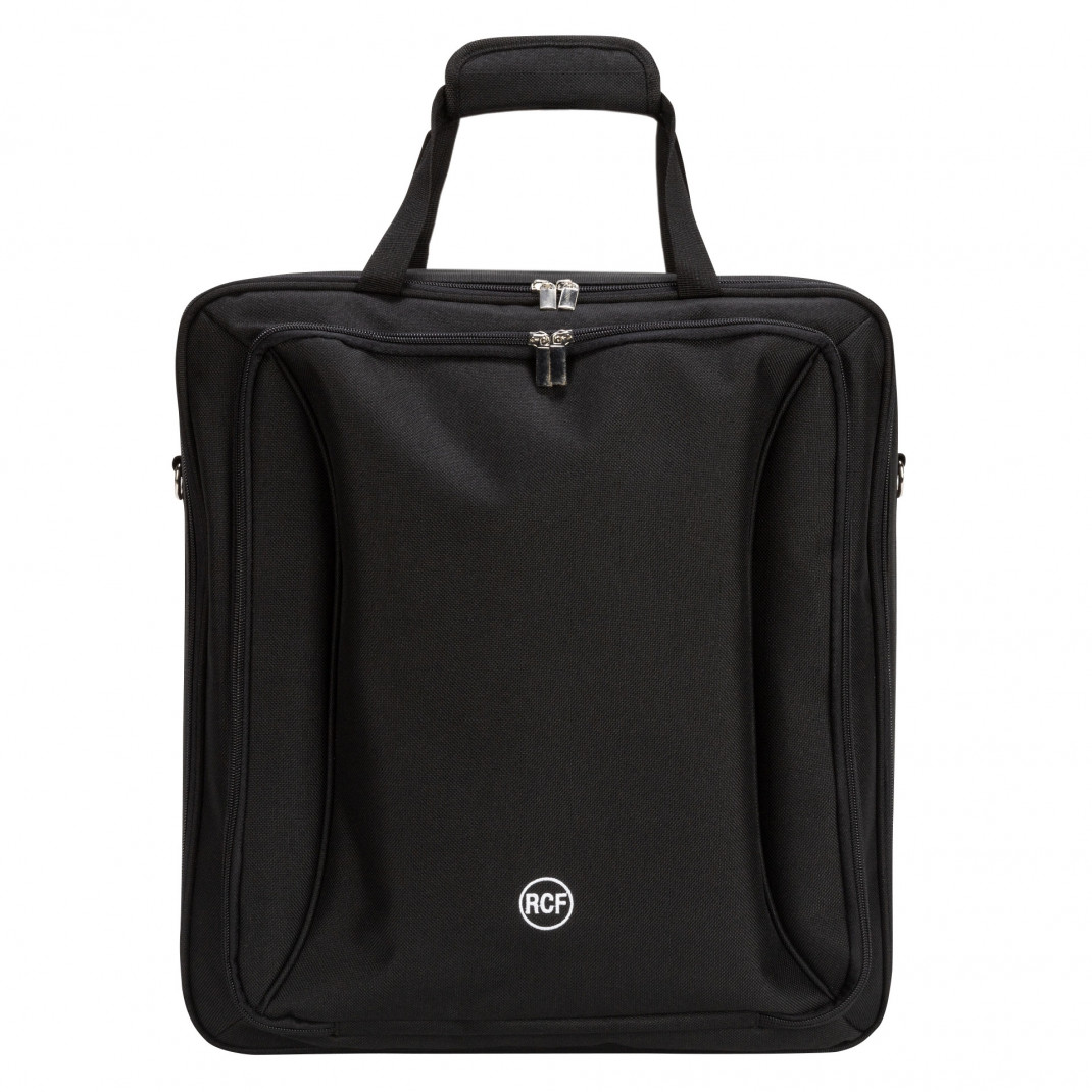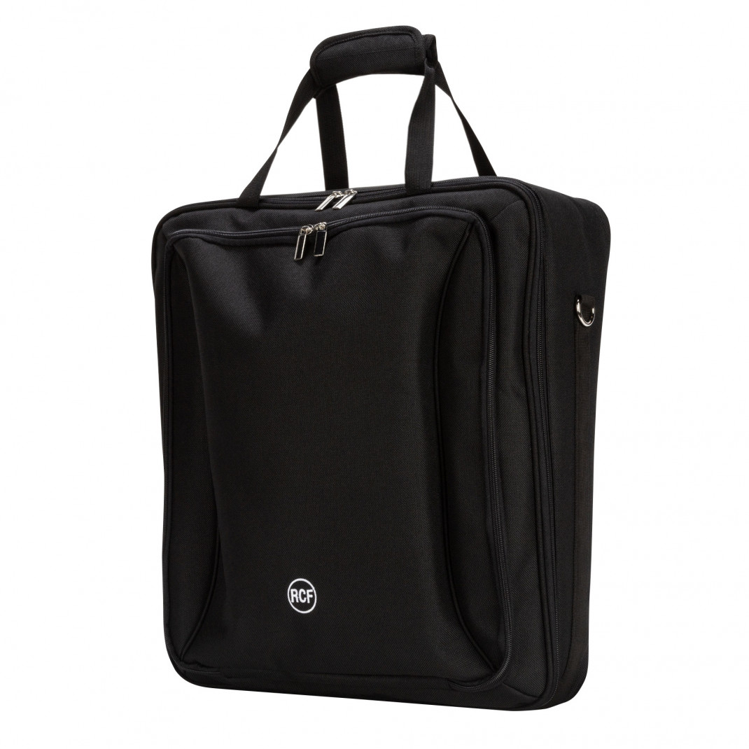 Gepolsterter Seesack für Mixer RCF M 20X und E 12 mit Handgriff und Schultertragegurt. Breite Vordertasche mit separatem Fach für Tablet-Computer oder anderes Zubehör.