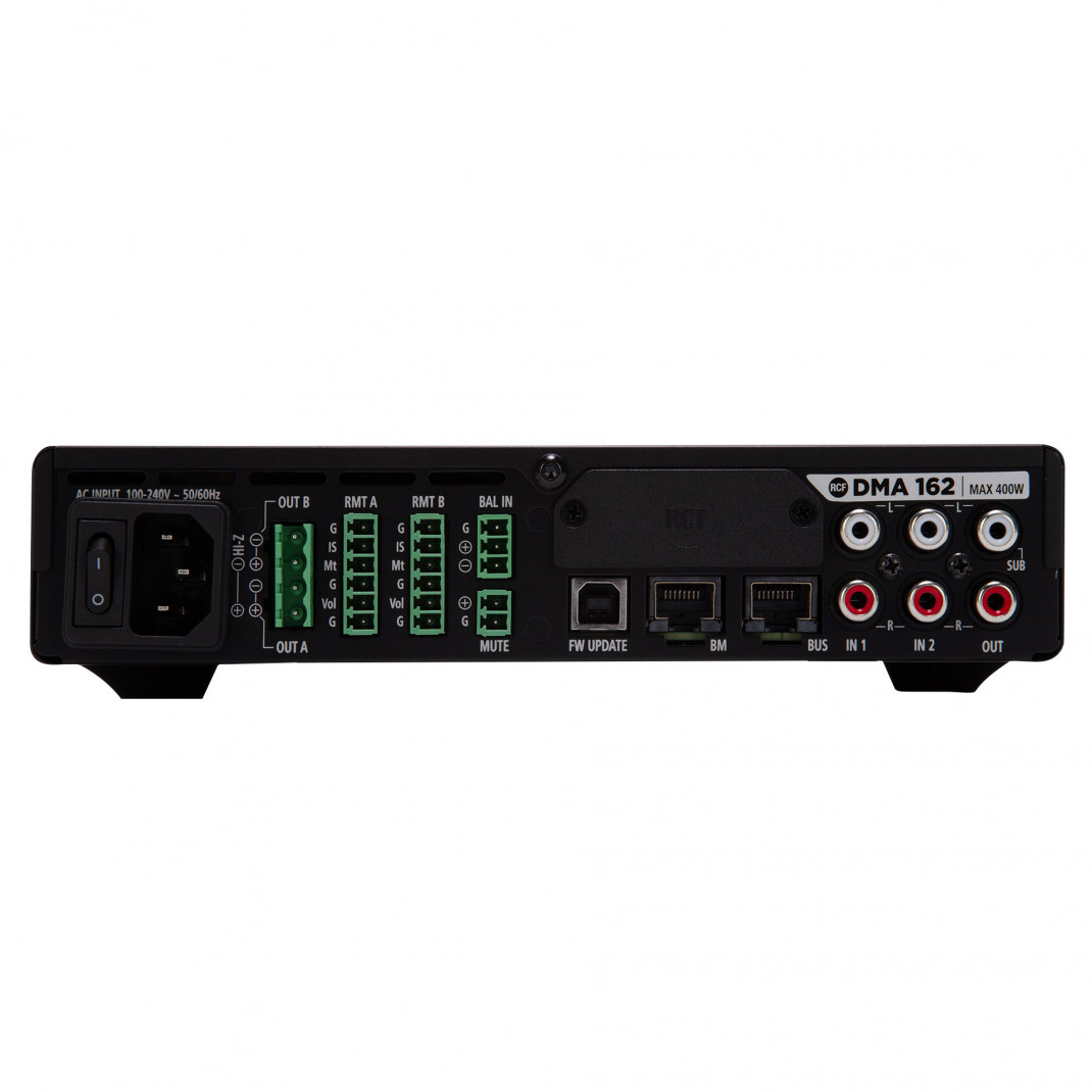 Die DMA 162 ist eine 2-Kanal-Class-D-Matrix-Endstufe mit leistungsstarker DSP für einfaches Management von Ein- und Ausgängen, Routing und EQ. Die umfassende Signalverarbeitung bietet Presets für RCF-Lautsprecher, einen speziellen Bass-Enhancer-Algorithmus, FIR-Filter und Equalizer zur klanglichen Anpassung an die Umgebung. Aufgrund ihrer extrem kompakten Maße, der präzisen Konstruktion und Zuverlässigkeit eignet sie sich für verschiedenste Anwendungen im professionellen Musikbereich