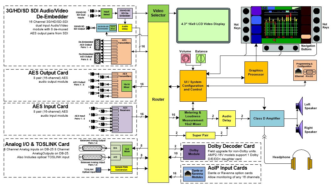 - Einzelne Bildschirmansicht von 16 Kanalanzeigen/Clustern, Phasenanzeige, Lautstärke, Dolby D, E und DD+ Präsenz und Hot-Key-Zuweisungen