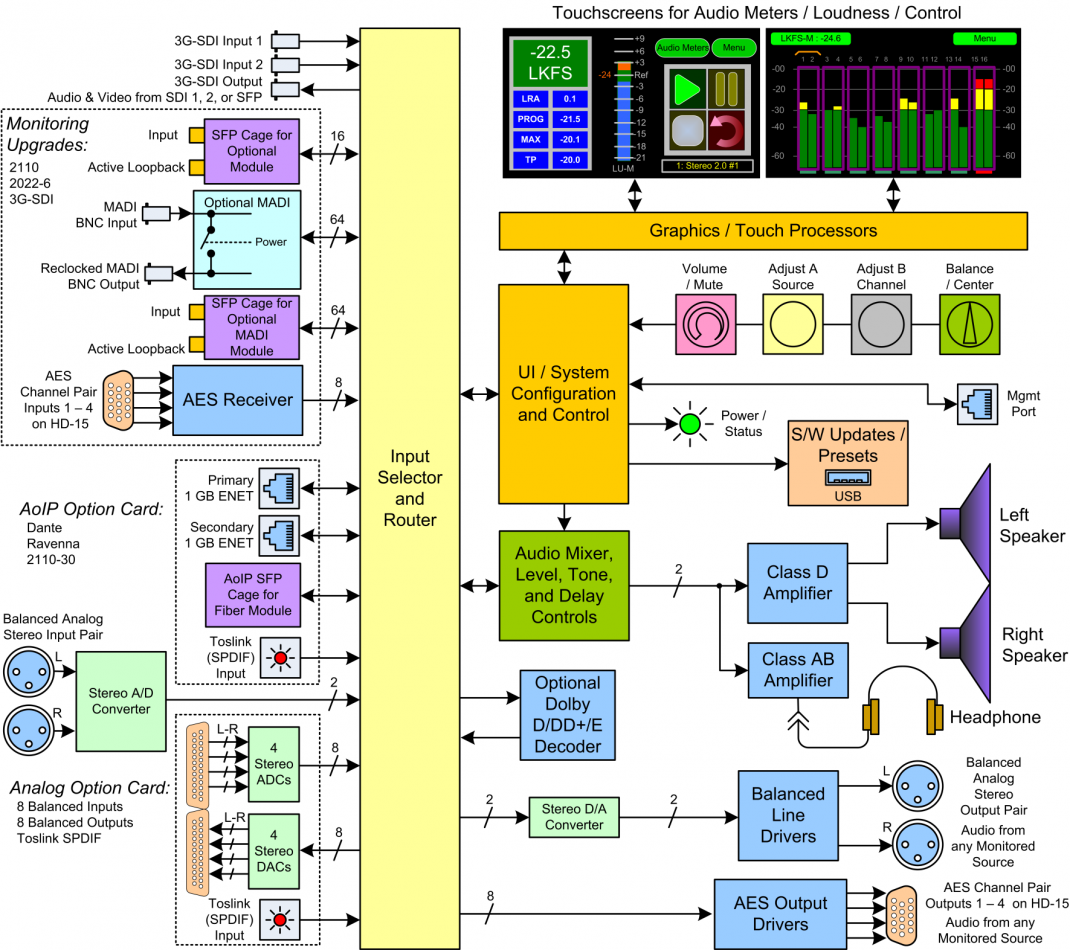 2RU Dual screen, 16 channel Dual Input, 3G/HD/SD-SDI, Audio Monitor with touch screen control. Includes a pair of analog Inputs and outputs on XLR. Includes Loudness, phase monitoring and up to 64 presets
