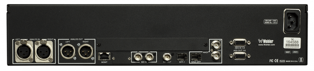 Zur Standardausstattung gehören 3G-SDI und ein Paar analoge Ein- und Ausgänge. Andere Signalformate und Verarbeitungsoptionen können je nach Bedarf aufgerüstet oder lizenziert werden, entweder bei der Erstausstattung oder nach dem Kauf. Zu den Optionen für zusätzliche Signale gehören DanteTM oder RavennaTM (mit Unterstützung von Hitless 2022-7), SMPTE-2110, SMPTE-2022-7, AES3 und MADI.