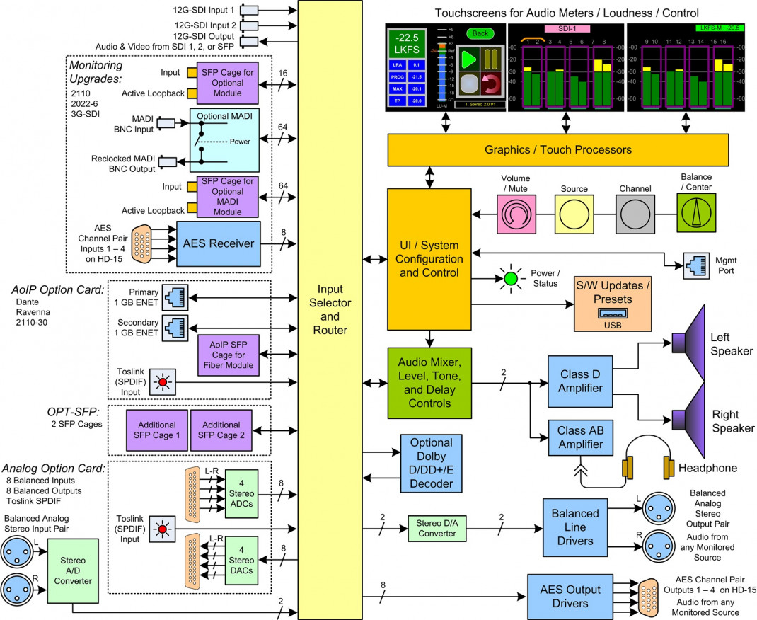 - Optionale E/A: für AES3 auf HD-15 (inkl. ausgewählter Audioquelle, die in AES3-Ausgang konvertiert wird), MADI auf BNC (durchgeschleift), und SMPTE 2110 oder SMPTE 2022 über SFP