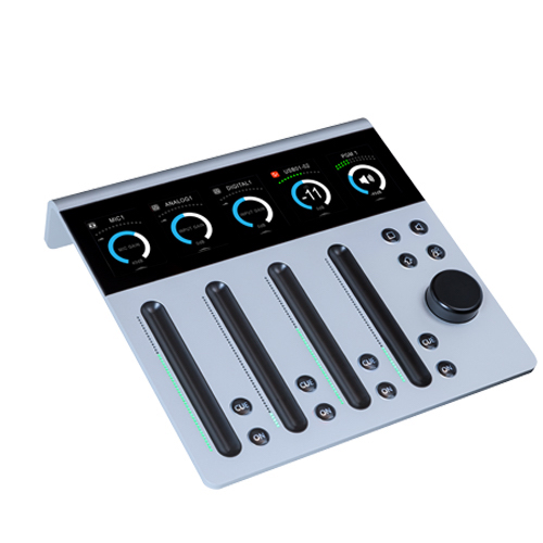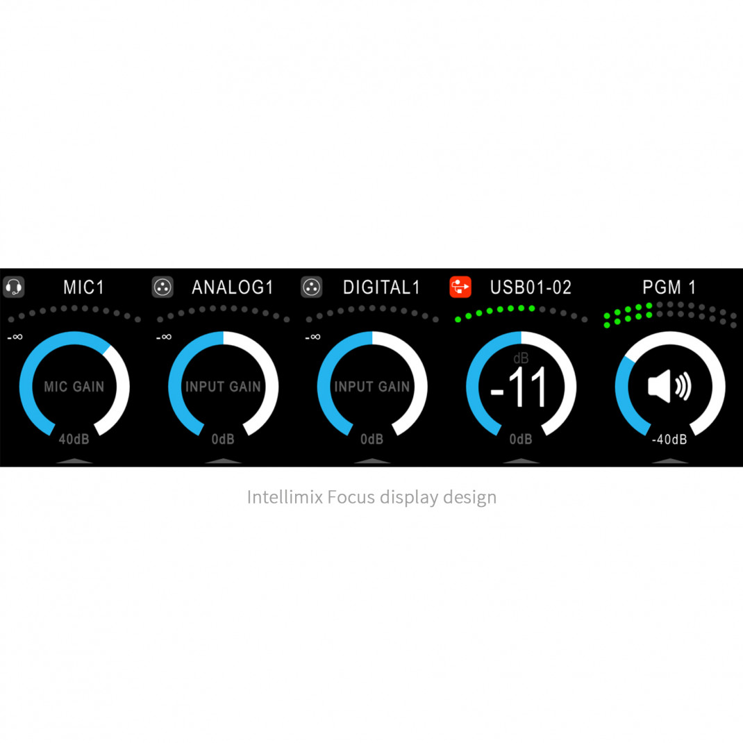 Intellimix FOCUS - 4CH /4 Fader Digital Desktop Mixer with G-Touch faders and His-Res TFT screen. Base unit with 3 XLR mic/line inputs, 2 XLR line inputs, 2 RCA line inputs, 3 AES iI/O's, 4 XLR line outputs, ADAT, DANTE, GPIO's