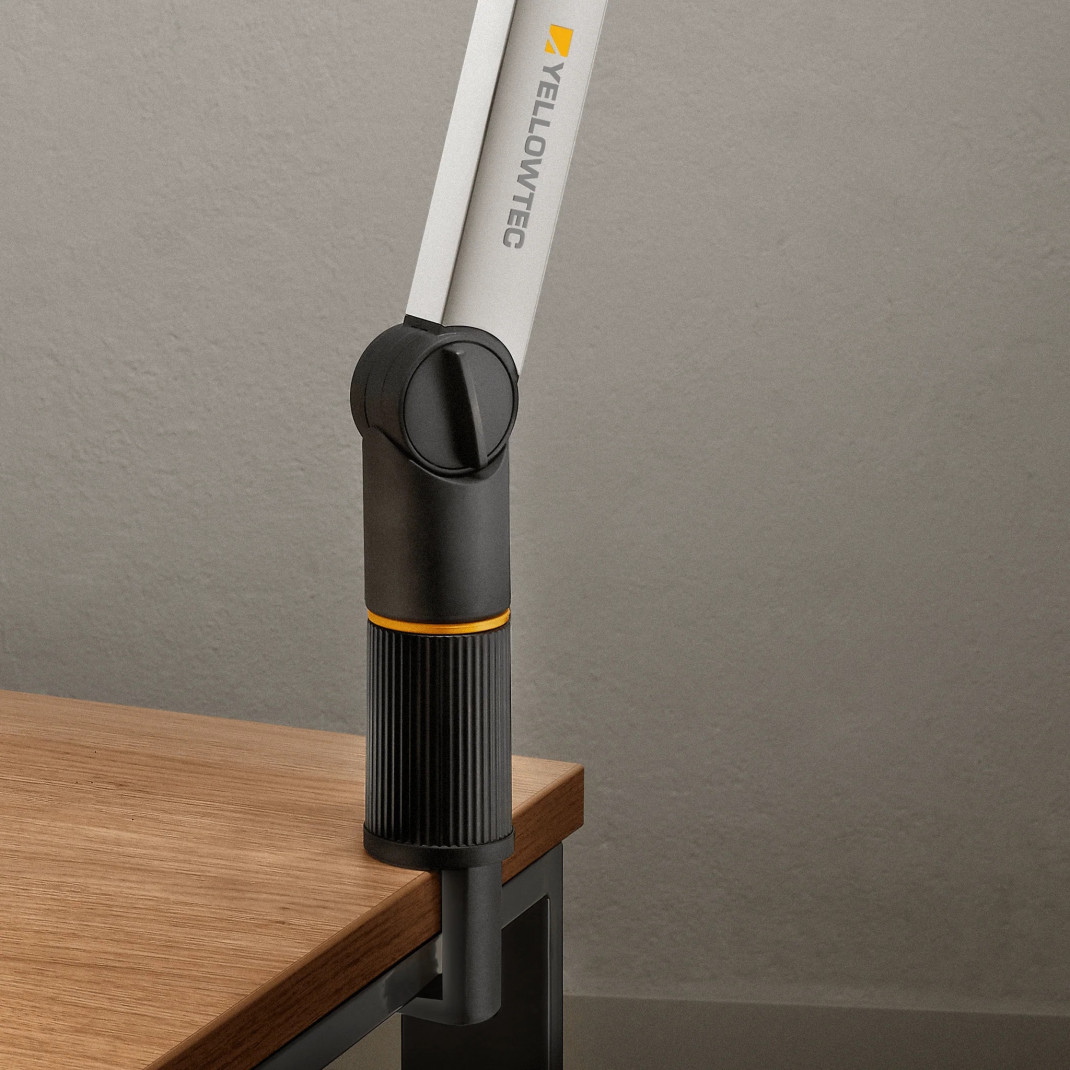 Die m!ka Tischklemme ist eine der Plug-In-Optionen zur Befestigung eines m!ka Arms an Ihrem Schreibtisch. Sie kann mit einem m!ka Mikrofonarm oder einem m!ka EasyLift Monitorarm kombiniert werden. Verwenden Sie die Tischklemme, um Ihren m!ka Arm an der Tischkante zu befestigen. Bitte befestigen Sie die m!ka Tischklemme an Ihrem Schreibtisch, legen Sie dann den gelben Abstandhalter darauf und schieben Sie den m!ka Arm Ihrer Wahl ein.Um eine optimale Anpassung an Ihren Tisch zu erreichen, setzen Sie die m!ka Table Clamp einfach an der Tischkante an und verdrehen Sie das Ober- und Unterteil gegeneinander. Die Tischklemme passt auf jeden Tisch mit einer Plattenstärke von 18-72mm. Verwenden Sie sie niemals auf gewölbten Flächen. Sie könnte abrutschen.