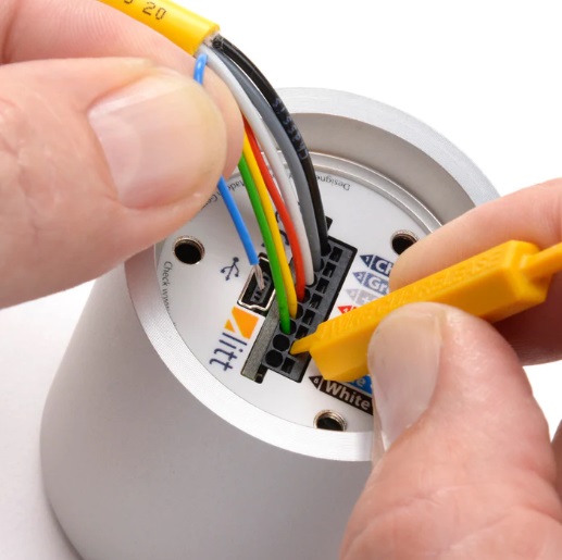 Das farbcodierte litt Systemkabel in der von Ihnen gewünschten Länge garantiert eine einfache Verdrahtung Ihres litt Signalgeräts. Wählen Sie es, um die Installation von verschiedenfarbigen litt Farbsegmenten zu vereinfachen.Stecken Sie einfach die farbcodierten Enden des Hybridkabels in die passenden farblich gekennzeichneten Klemmen des Anschlussfeldes Ihres litt Base Controllers. Die AWG-Standardlitzen des Systemkabels passen perfekt in das Anschlussfeld des litt Base Controllers und der litt Base Controller Wall Mount.