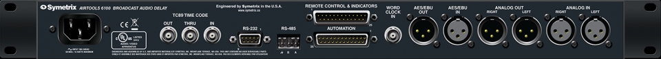 6100 avec panneau est un dispositif utilisé pour retarder l'audio de diffusion pour le contrôle d'obscénité ou les pauses de talent. Lorsqu'elle est activée, cette unité retarde la programmation jusqu'à 40 secondes. Il est doté d'une interface de commande d'automatisation, d'une entrée/sortie audio numérique et d'une entrée/sortie de code temporel.Interface de contrôle d'automatisation