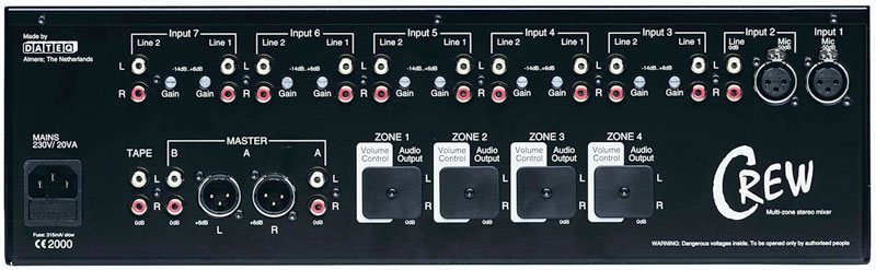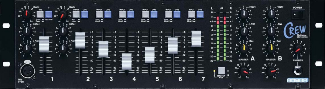 Le DATEQ Crew est un mélangeur à sept canaux de 19 pouces. Il convient parfaitement à une utilisation dans les pubs, les écoles de danse, les centres de conférence, etc. Le Crew est équipé de trois entrées micro et de 11 entrées ligne stéréo.Le canal 1 est équipé d'un circuit de talk-over pour améliorer l'intelligibilité de la parole. Ce circuit, qui est déclenché par le signal du microphone du canal 1 (c'est-à-dire qu'il est activé par la voix), garantit que ce signal a la priorité sur tous les autres. La fonction de talk-over peut être désactivée à l'aide du commutateur TalkOver situé en façade.