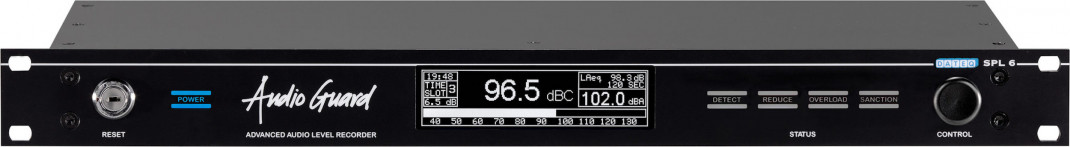 Audio Level Guard avec microphone de mesure, réglable par Threshold et Output, à plomber, dB(A), dB(C) and dB-peak, 10-Band EQ et 10-Band Limiting, XLR in/out, 19" 1U