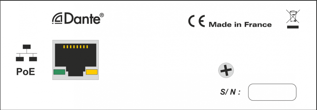 Le PCS310 est un amplificateur casque encastrable avec connectivité DANTE.La communication est assurée par un câble réseau RJ45, véhiculant à la fois les informations audio et l'alimentation (PoE)