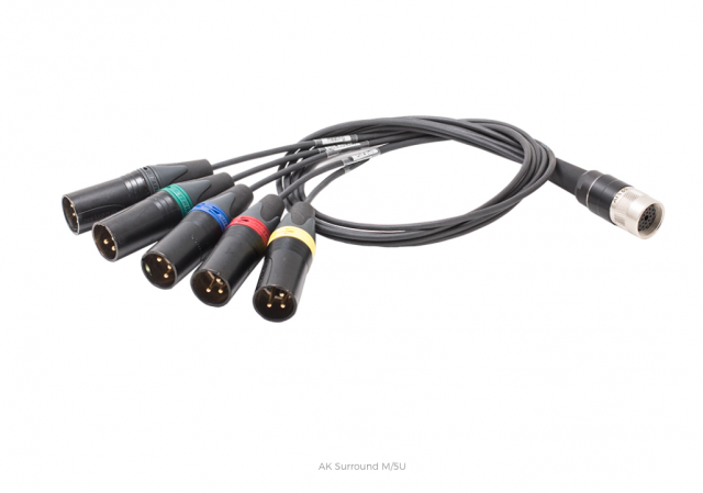 Pour les enregistrements surround avec jusqu'à six canaux (par ex. surround 5.1), il existe les câbles K Surround x M avec des connecteurs multibroches aux deux extrémités ("x" correspond à la longueur en mètres). Le câble adaptateur AK Surround M/4U divise ce câble multiconducteur en quatre XLR-3. Il est également disponible en tant que AK Surround M/5U pour cinq canaux. Pour l'utilisation de six canaux, il existe la boîte de split M/6U.Il est également disponible avec une connexion pour l'alimentation du système de chauffage (AK Surround H M/4U).
