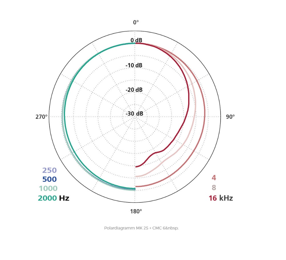 Avec la MK 2XS (anciennement MK 3), nous avons créé un type de capsule qui, à grande distance de la source sonore - c'est-à-dire dans un champ sonore diffus, en dehors du rayon de réverbération - compense les pertes dans les aigus et éclaircit quelque peu la composante spatiale. L'accentuation des aigus indiquée dans la réponse en fréquence disparaît dans la pratique lorsque le microphone est placé loin de la source sonore dans les pièces.En revanche, en cas d'incidence sonore frontale à une distance réduite, l'accentuation des aigus se fait nettement sentir, ce qui donne une image sonore particulièrement brillante.
