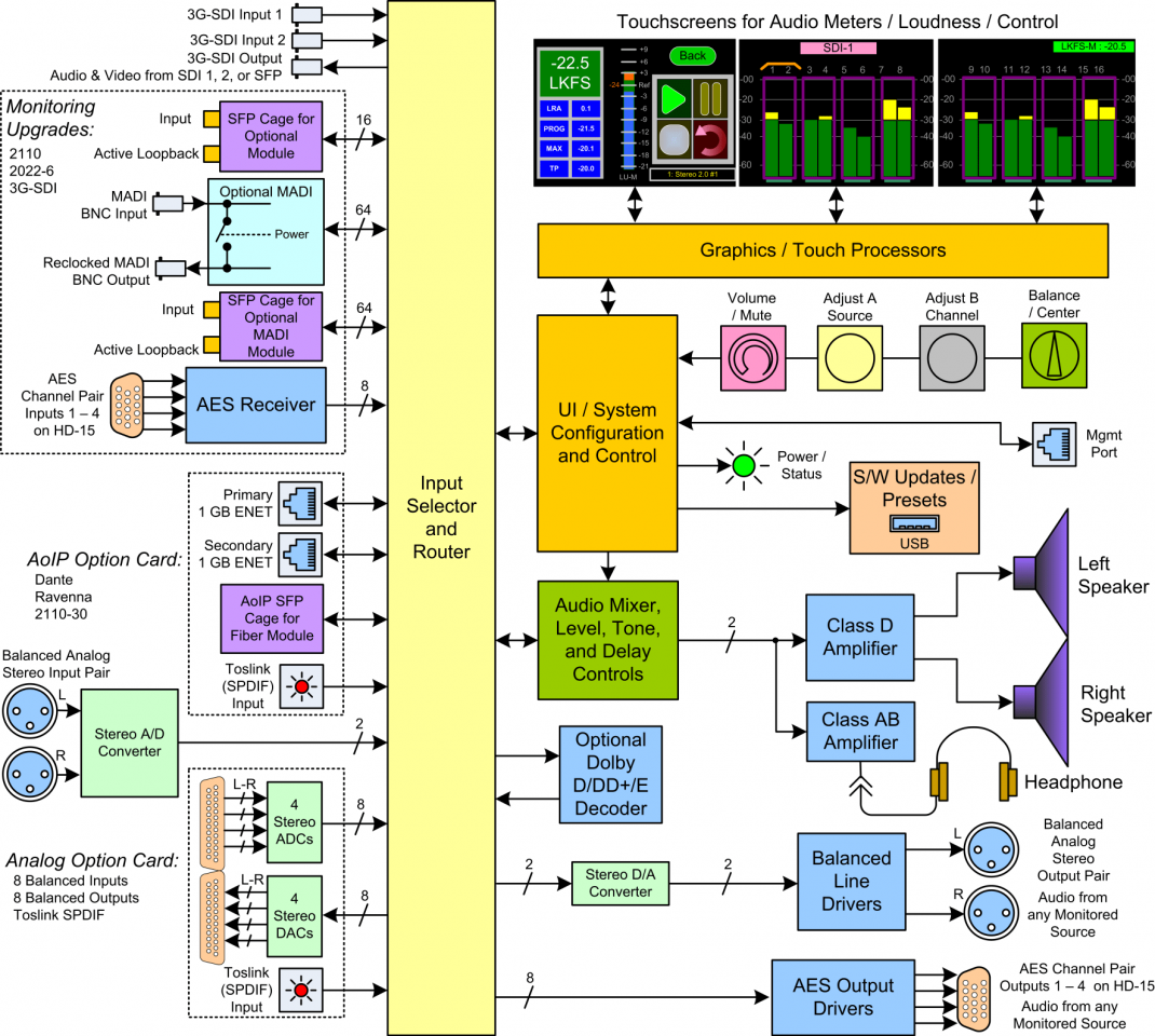 Les caractéristiques standard comprennent le 3G-SDI et une paire d'entrées et de sorties analogiques. Il est possible de mettre à niveau/licencier d'autres formats de signaux et options de traitement, en fonction des besoins, soit au départ, soit après l'achat. Les options pour les signaux supplémentaires incluent DanteTM ou RavennaTM (avec support hitless 2022-7), SMPTE- 2110, SMPTE-2022-7, AES3 et MADI.