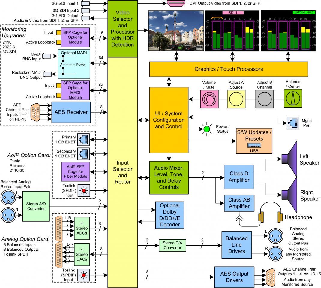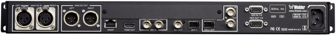 - E/S optionnelles : pour AES3 sur HD-15, (y compris la source audio sélectionnée convertie en sortie AES3), MADI sur BNC (sortie en boucle), et SMPTE 2110 ou SMPTE 2022 via SFP.